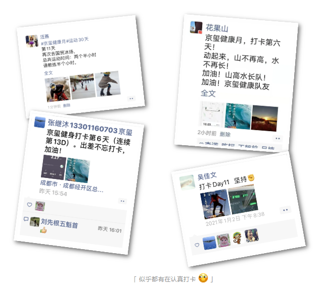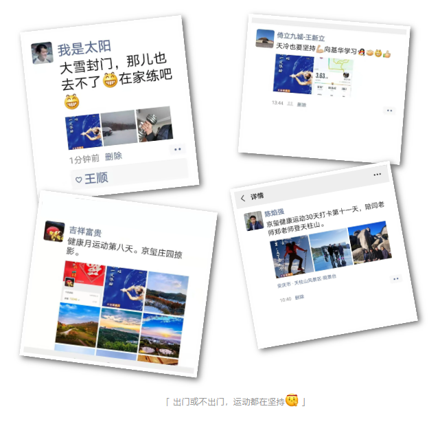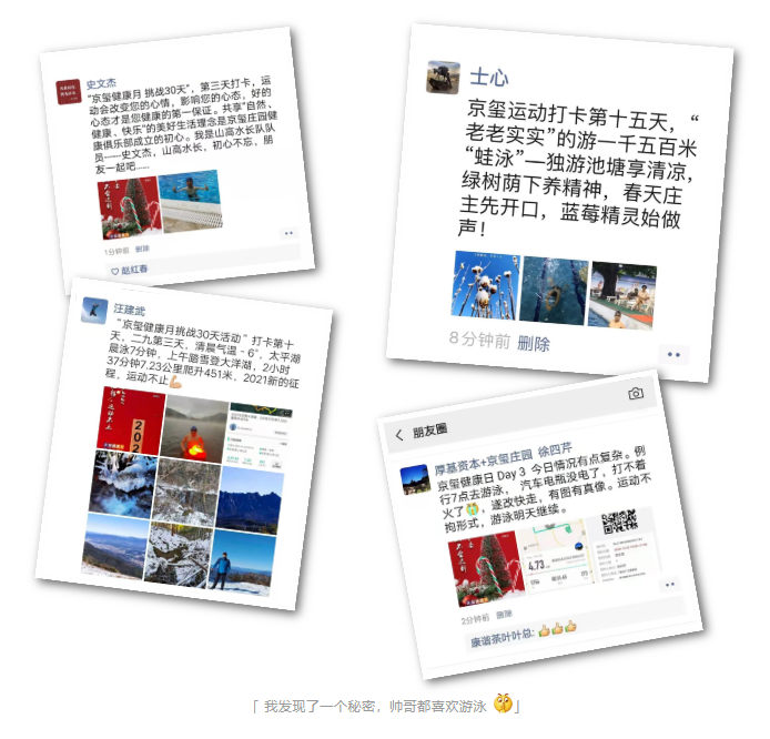冒著零下酷寒,有一群人每天堅持運動,游泳、跑步、登山、健身操、瑜伽、乒乓球、網(wǎng)球……工作和健康一樣不落。對于熱愛運動的他們而言,沒有什么能夠阻擋他們的熱情,哪怕是如北極一樣寒冷的天氣。他們就是參加“京璽健康月 挑戰(zhàn)30天”打卡活動的每一位參與者。從2020年12月23日起,至2021年1月6日,活動已經(jīng)進(jìn)行了一半,但能在酷寒天氣里堅持每天鍛煉,實屬不易,除了良好的身體素質(zhì)外,更需要強(qiáng)大的動力和信念。你是否會好奇,他們是如何做到的?