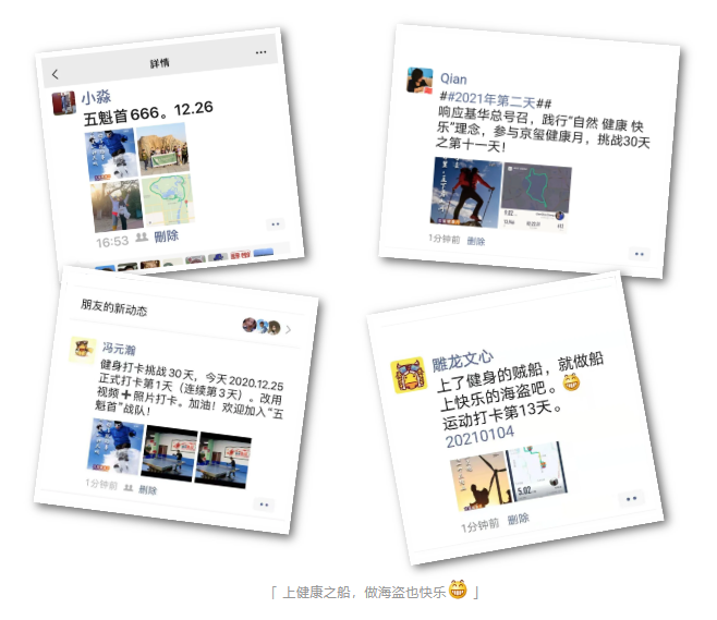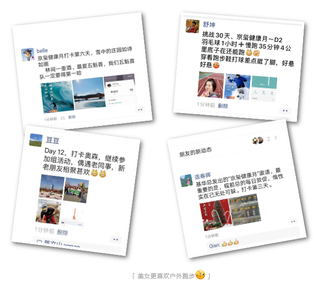 而自京璽健康俱樂部成立儀式現(xiàn)場組隊后,4個小組(五魁首隊、雄鷹隊、山高水長隊、鴻雁隊)也開啟了相互鼓勵與PK模式。每日督促打卡,周末組織線下活動,十分有趣。