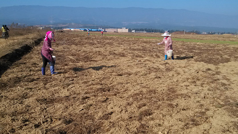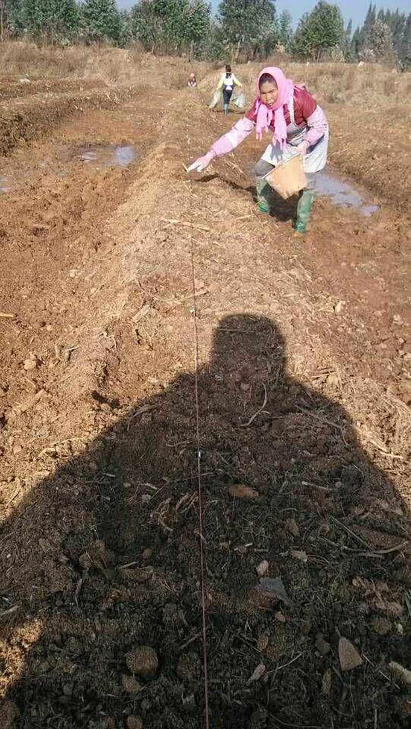 2、撒肥人員做好防護(hù)措施,將硫磺粉、毒死蜱、復(fù)合肥、均勻撒施,硫磺粉不得出現(xiàn)較大結(jié)塊,若硫磺粉有較大結(jié)塊需過篩;毒死蜱顆粒需單人撒施(單位面積用量較少2Kg/畝)