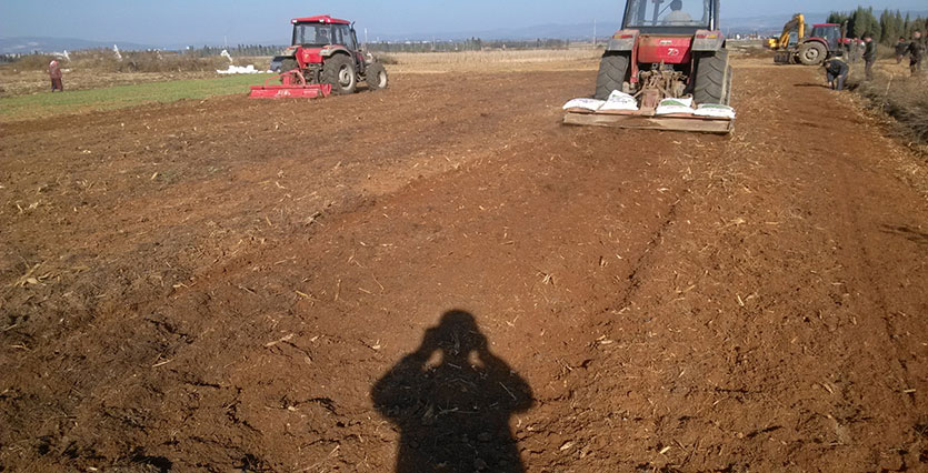 2、被運(yùn)料貨車壓緊地塊旋耕次數(shù)增加,直至攪拌均勻;